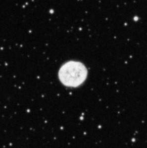 At 40x the nebula looks like a slightly fuzzy star and is easy to see with averted vision. At 171x the nebula appears as a bright, roundish disk with a slightly diffuse edge. The bright disk is surrounded as well by a much fainter diffuse halo. However, the 13m0 star to the west was not visible.