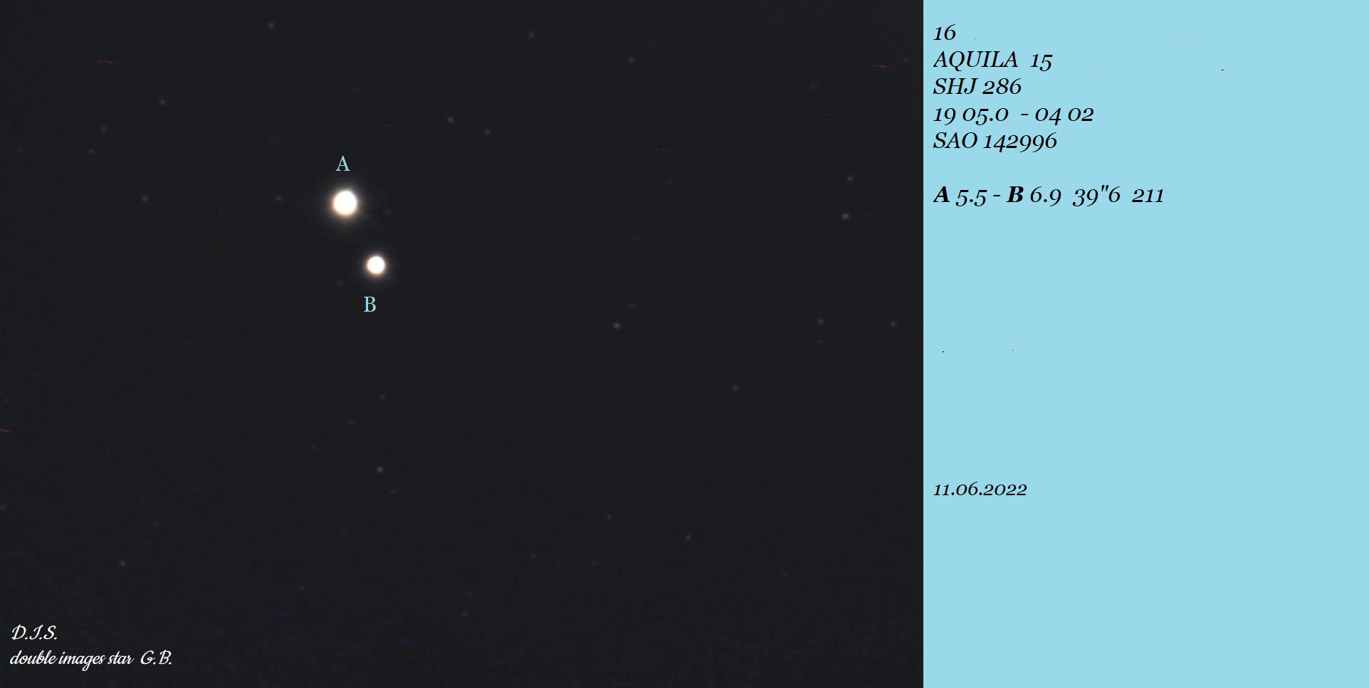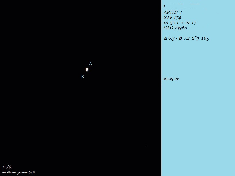 AB: einfach - beide Sterne zeigen sich komfortabel getrennt - Komponente A strahlt gelblich - Komponente B südöstlich wirkt dagegen grau und ist 1.5 bis 2 Größenklassen schwächer |