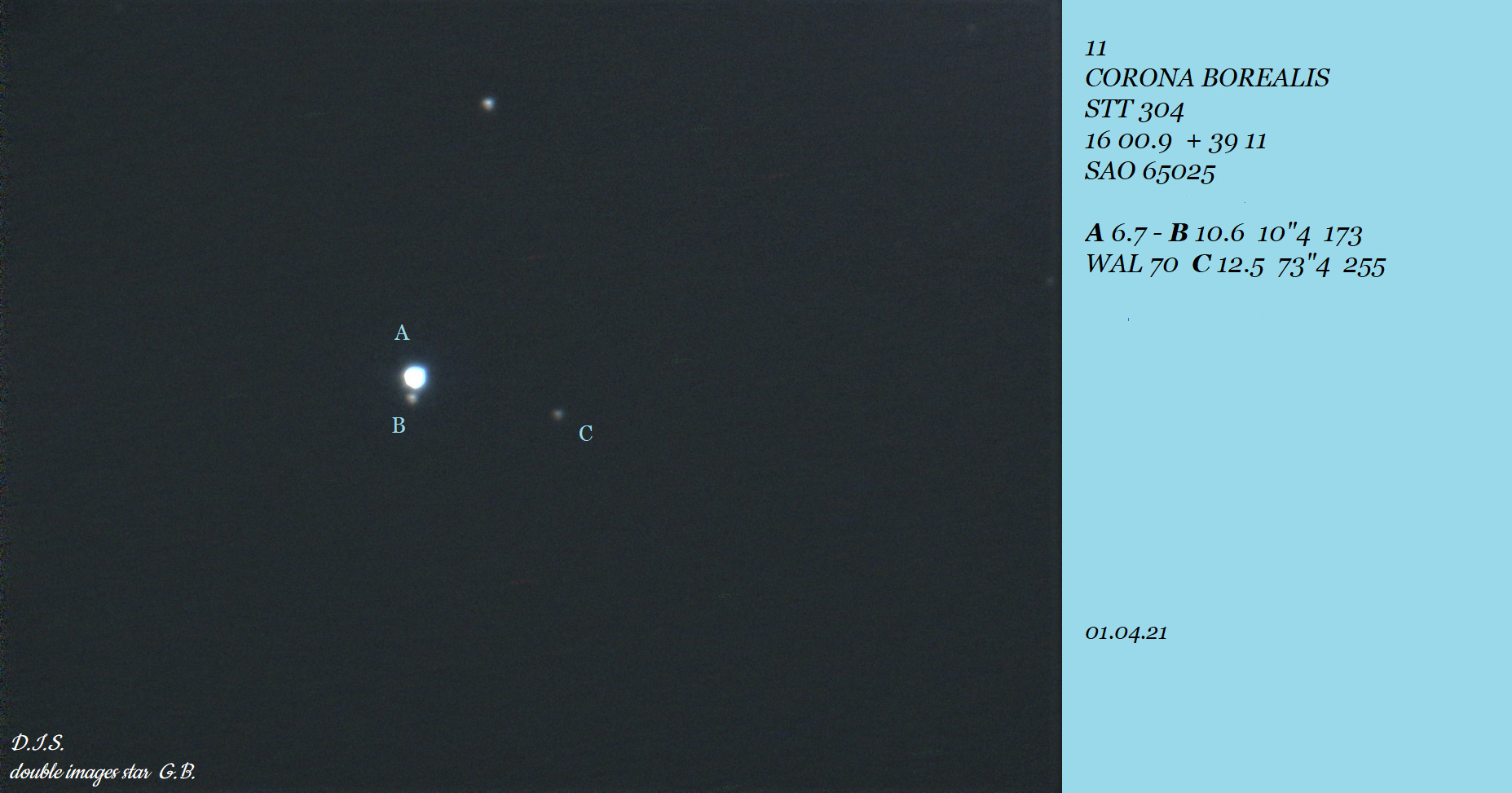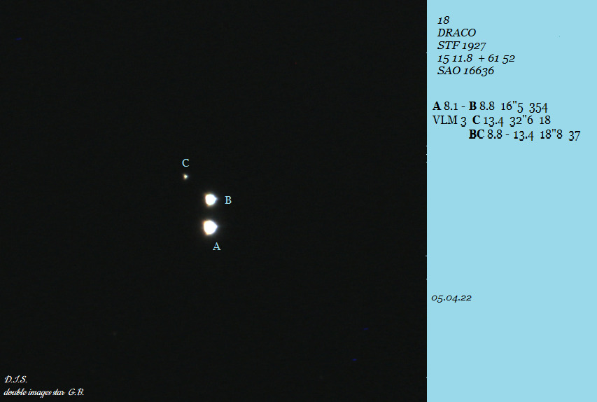 05.04.2020: Komponenten A, B und C einfach sichtbar mit abnehmender Helligkeit. Die Komponente D habe ich nicht beachtet. A: weiß-gelblich, B: blass orange. Der Anblick im 8x40 Fernglas gefiel mir besser. |