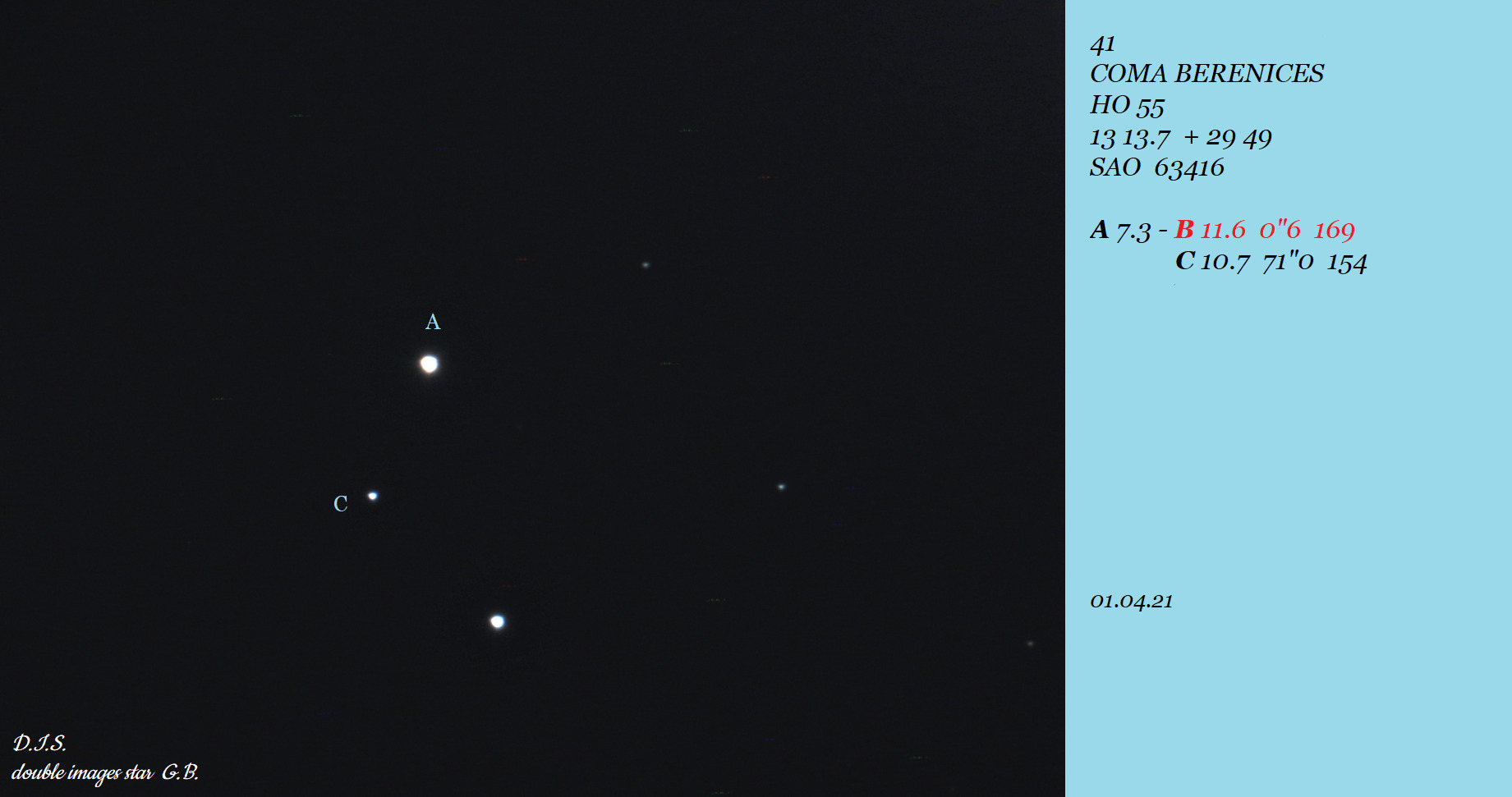 AB: 02.03.2021: Eher schwacher Doppelstern mit gut sichtbarer Helligkeitsdifferenz und moderatem Abstand. Leicht orange & grau-bläulich. Nördlich im gleichen Gesichtsfeld befindet sich der auffällige Doppelstern STTA 116. |