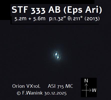 AB: Bei 57x nur knapp getrennt, wobei die B-Komponente als schwaches Sternchen erscheint. Bei 120x ist die B-Komponente deutlich und leicht elongiert auf dem ersten Beugungsring der Hauptkomponente zu sehen. Sehr schön. |