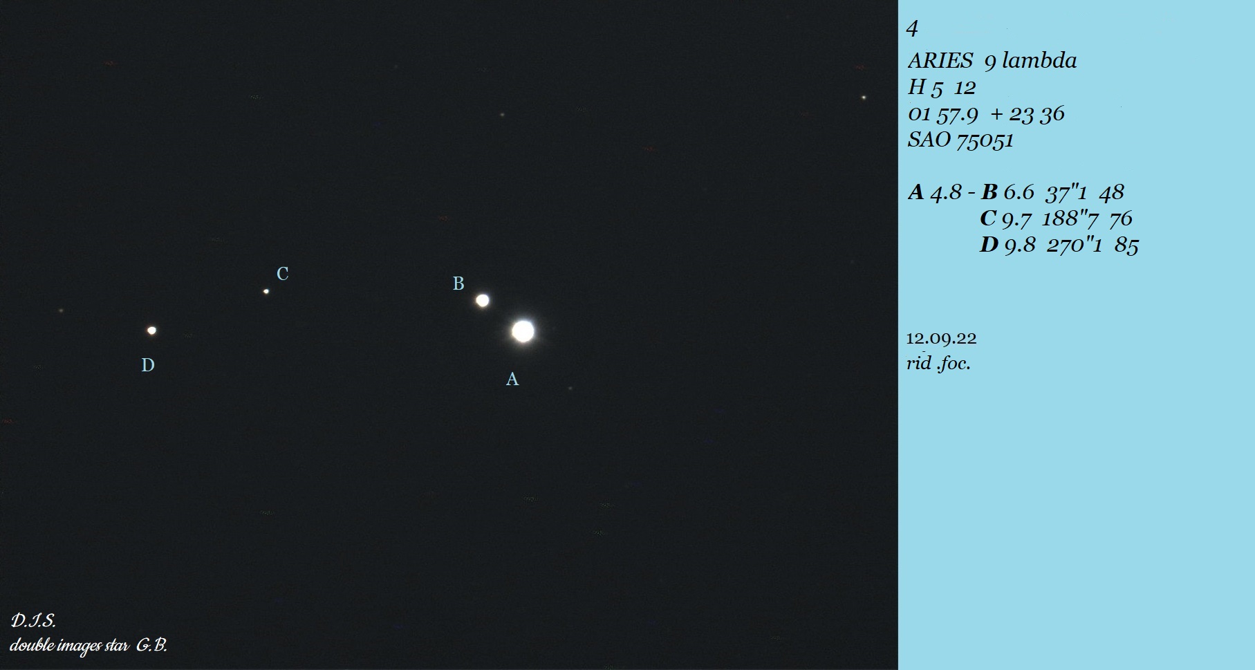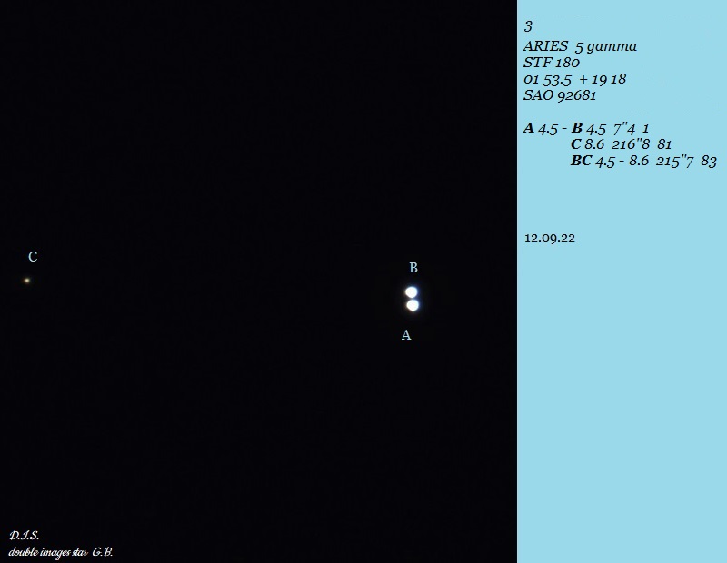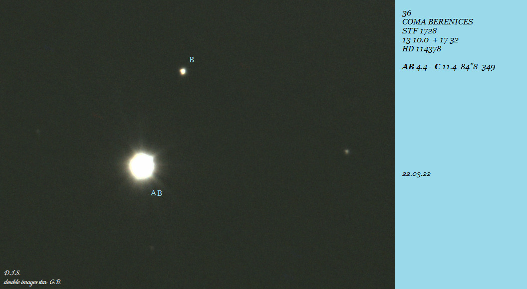 AB: ~3.5" and ~1 delta mag. Double double with STF 3012 |