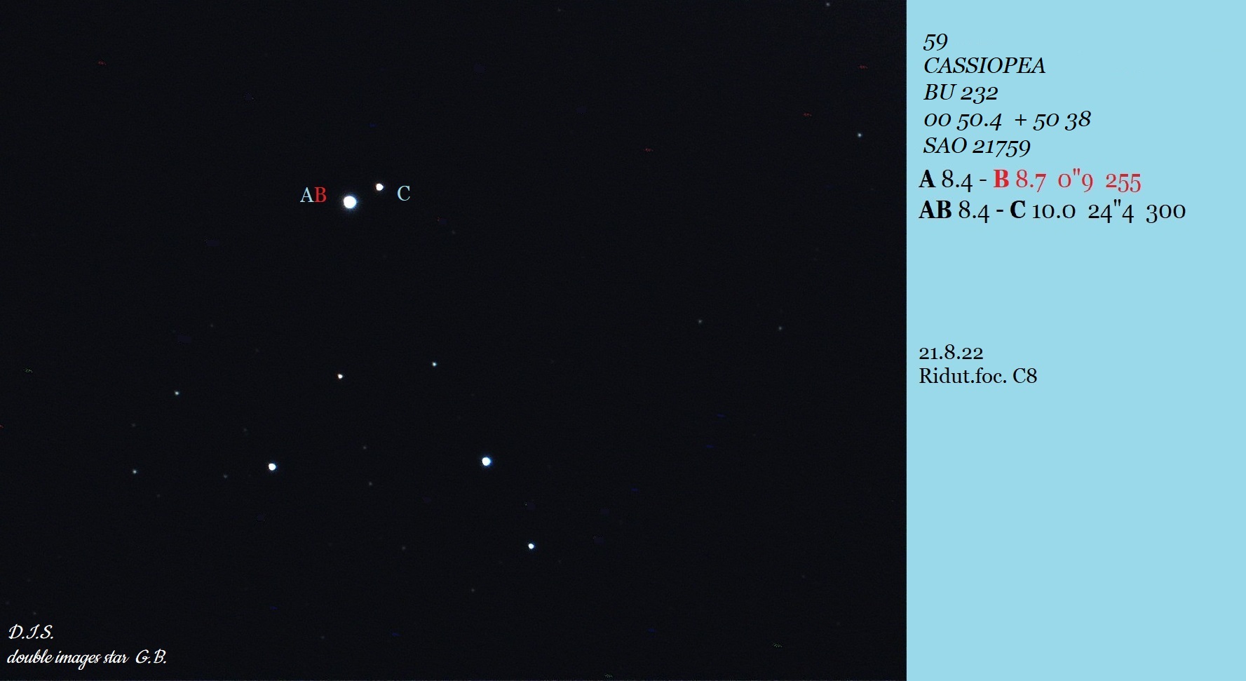 A-BC: Laut Stelledoppie bilden A und BC ein physikalisches Paar, und B und C sind wieder ein enges physikalisches Paar, also ein echtes Dreifachsystem in 150 Lichtjahren Entfernung. Für die Trennung von A-BC reicht eigentlich eine kleinere Öffnung, aber mit 8 Zoll kommt der Farbkontrast von A zu BC heraus und das Paar dominiert das Sehfeld von 0,3°. Sehenswert, denn A ist zitronengelb, BC ziegelrot. |