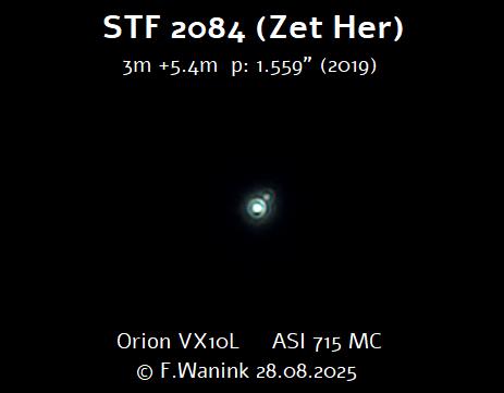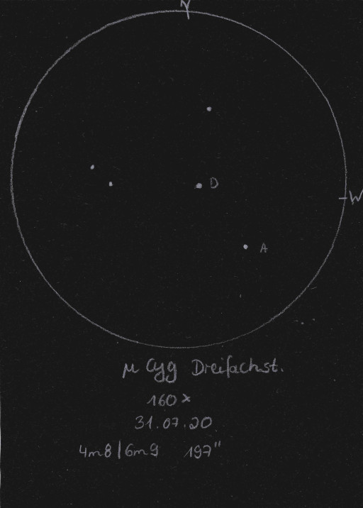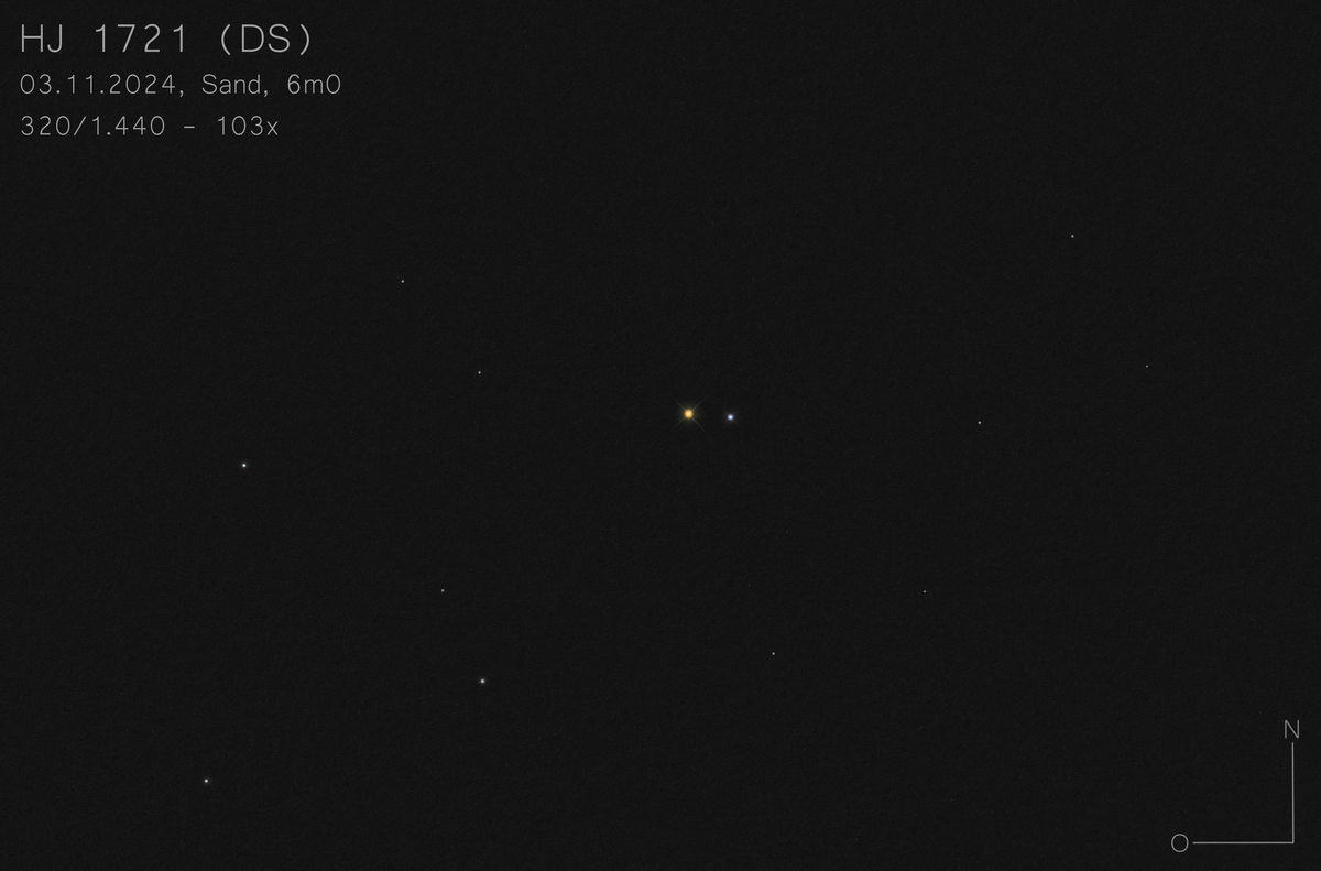 AB: 20x reicht zwar schon für eine klare Trennung, aber Komponente B im Osten ist nur dumpf grau-blau und noch zu schwach für den schönen Farbkontrast, der sich bei 32x offenbart - Komponente A strahlt dann in einem satten Bernsteingelb, B im Osten gibt sich unterkühlt bläulich - Helligkeitsunterschied 1 bis 1.5 Größenklassen, schwierig abschätzbar wegen der Farben |
