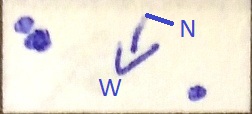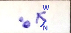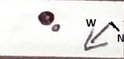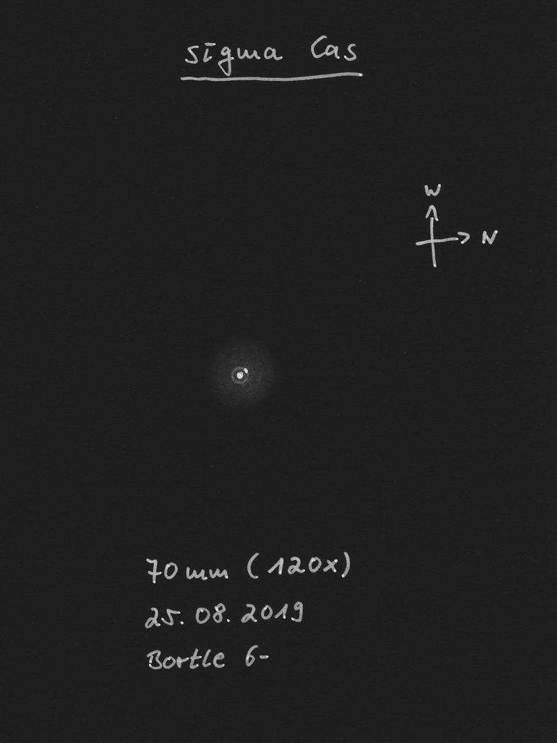 AB: Clearly split. A definitely brighter than B. Under a NELM 5m5 sky both components appear weak in these mini-binoculars and no colour impression arises.; WZ Cas is the variable designation of component A of STTA254. This semiregular carbon star has a mean brightness range of 6m8 to 7m7, and can reach extreme values of 6m3 at one end and 8m8 at the other. Perhaps it was too deep in a minimum at the time of observation to show colour with 1 inch of aperture? 15x45 binoculars revealed colour in this night, see observation below. |