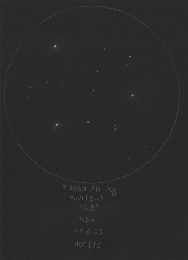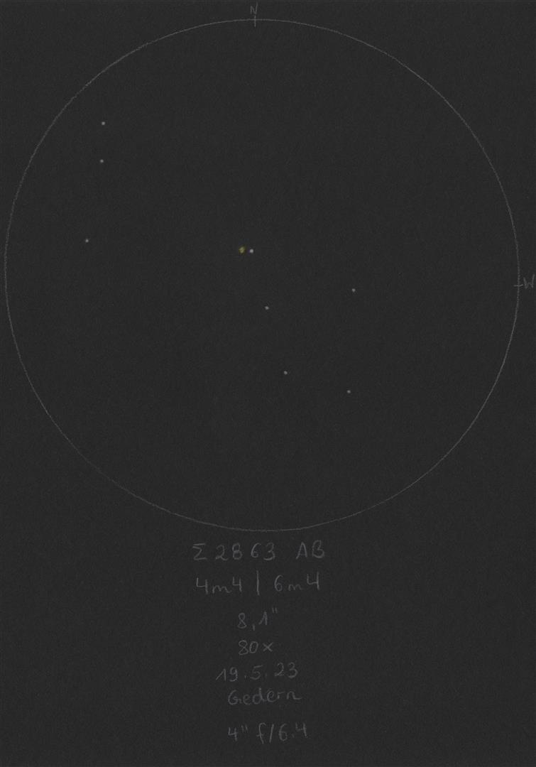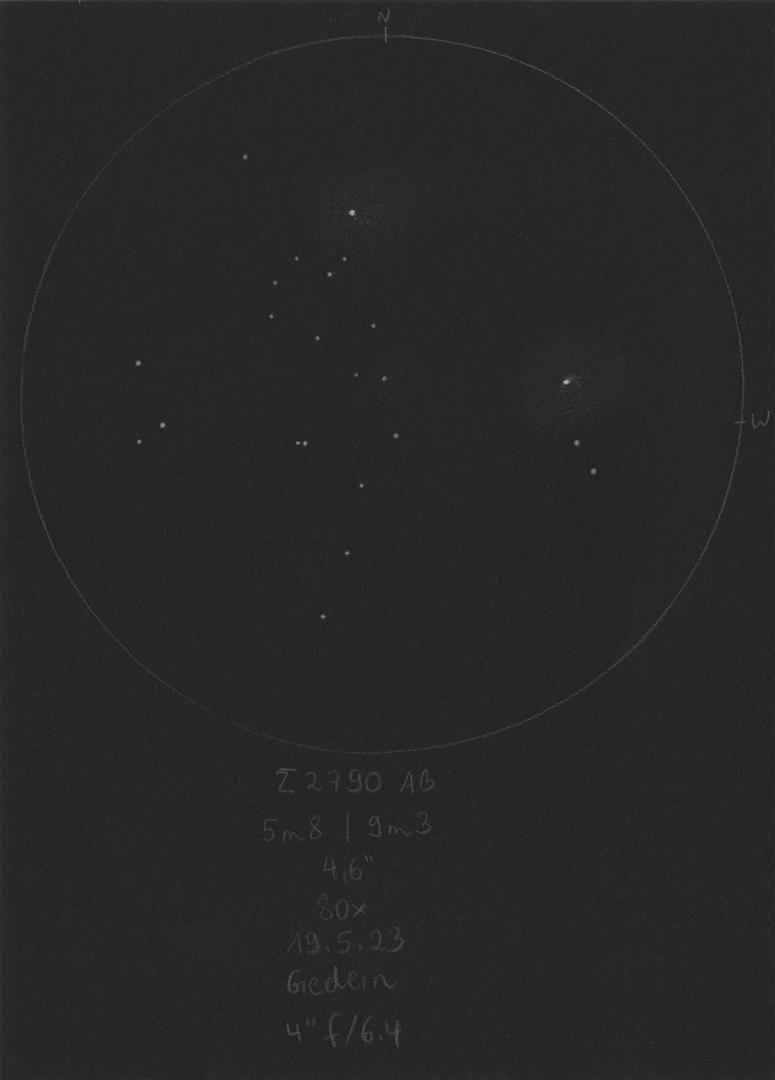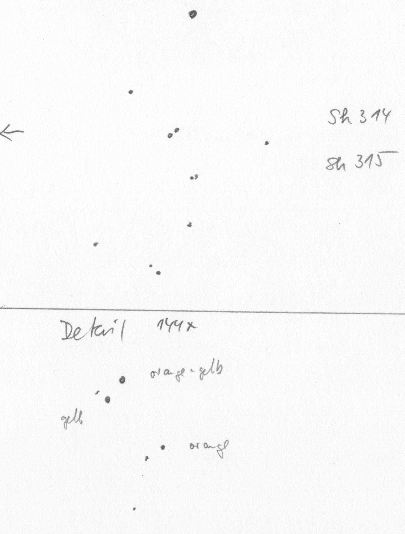 AB: bei 45x wirkt B deutlich schwächer (geschätzt zwei Größenklassen) und steht komfortabel abgesetzt im NO von A - Komponente A hat eine eigentümliche Farbe, schattengelb, B ist blaugrau |