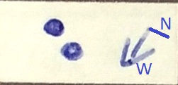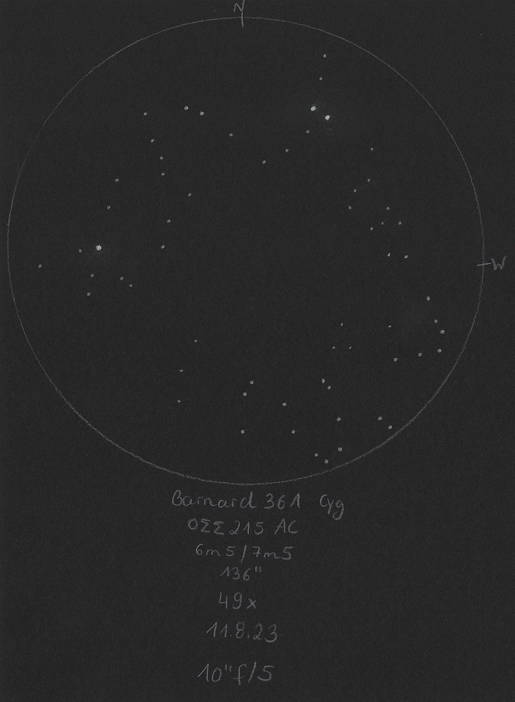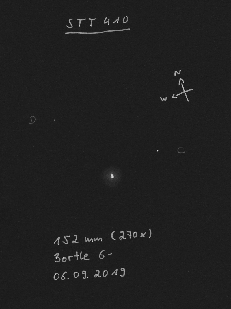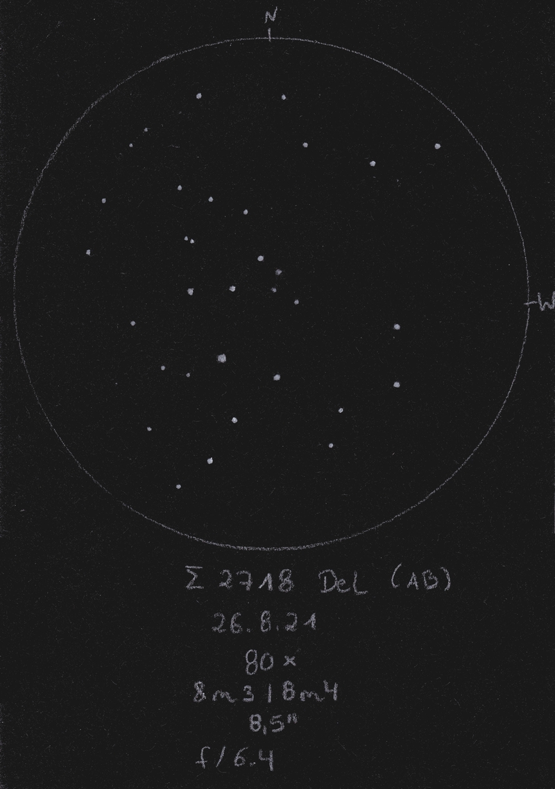 AB: bei 45x wirkt B deutlich schwächer (geschätzt zwei Größenklassen) und steht komfortabel abgesetzt im NO von A - Komponente A hat eine eigentümliche Farbe, schattengelb, B ist blaugrau |