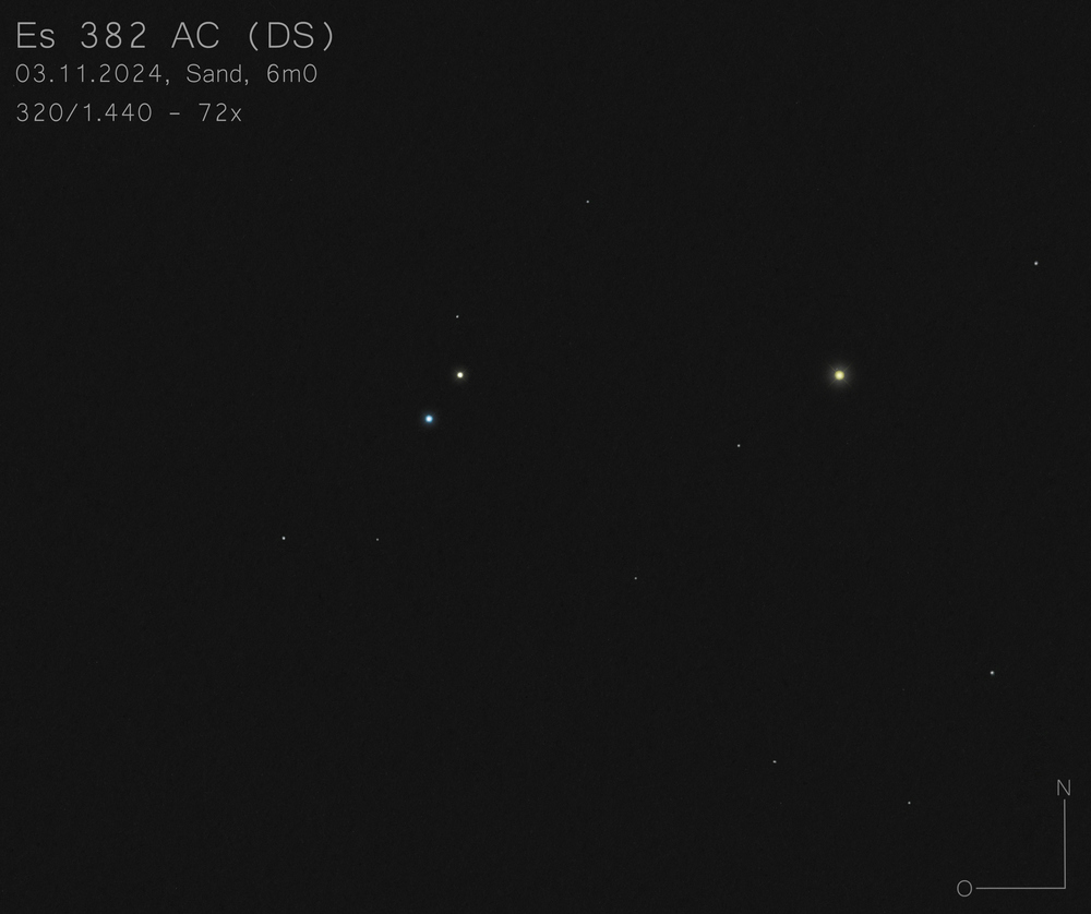 STT507 (AC): bei 29x zeigen dich beide Komponenten weit getrennt - A strahlt weiß, B im Norden wirkt kupfergrau und ist 2 Größenklassen schwächer |