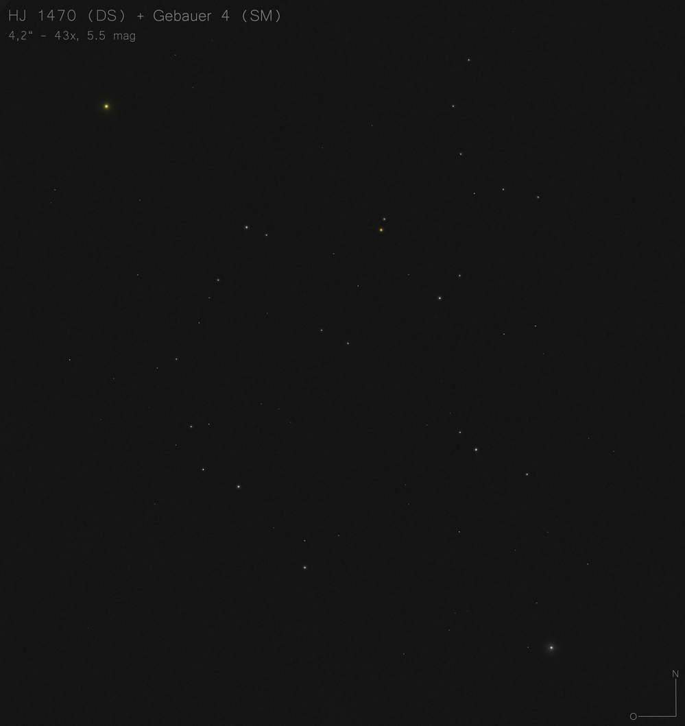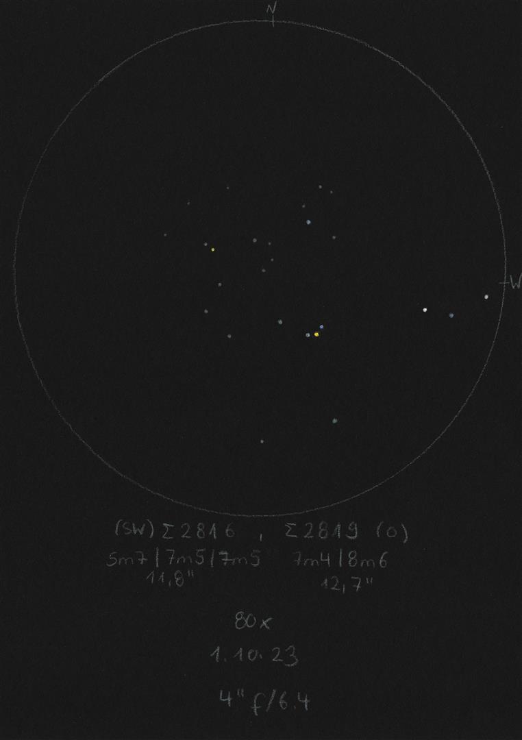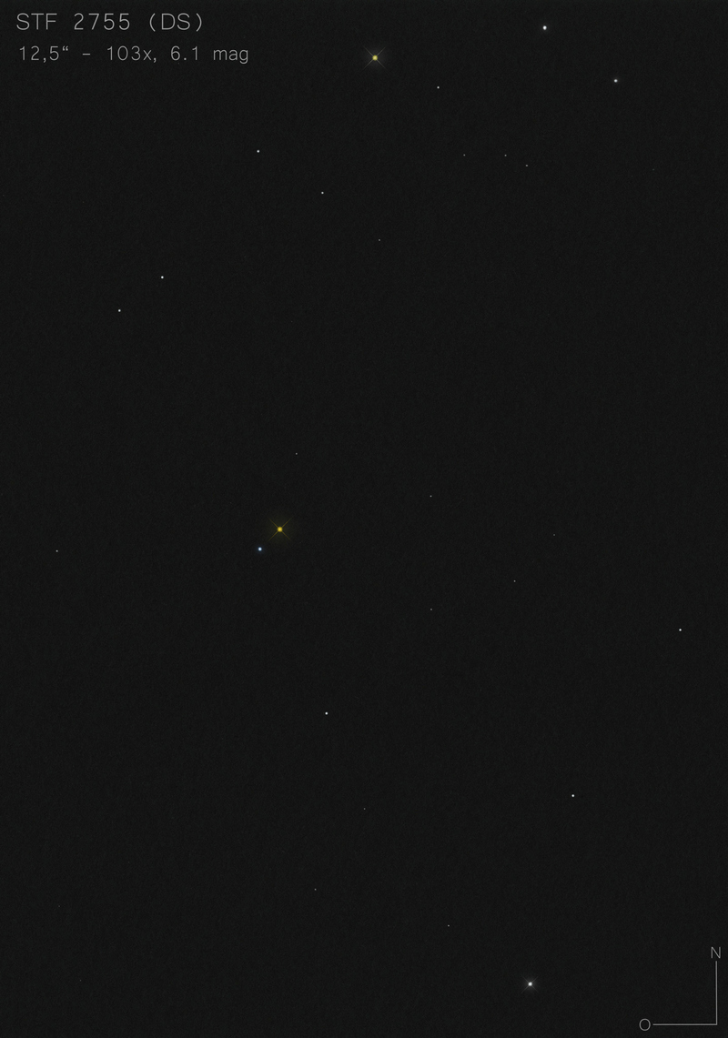 AB: einfach - beide Sterne zeigen sich komfortabel getrennt - Komponente A strahlt gelblich - Komponente B südöstlich wirkt dagegen grau und ist 1.5 bis 2 Größenklassen schwächer |