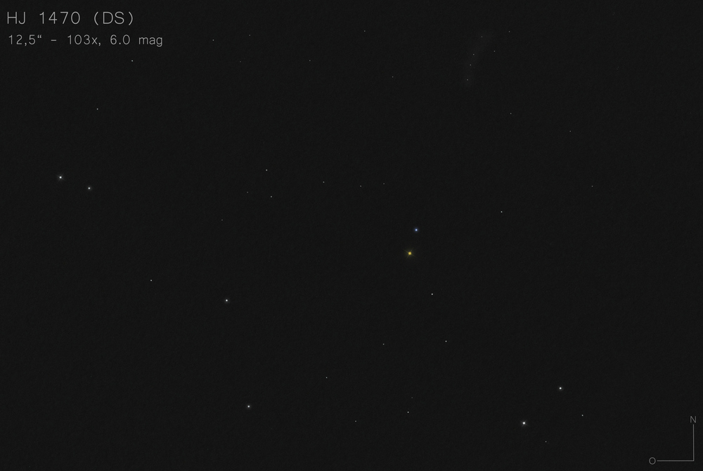 AB: bei 29x ein wunderschönes Sternpaar mit einem auffälligen Farbkontrast, weit getrennt - Komponente B wirkt weißgrau bis weißblau gegen die gelborange strahlende A-Komponente - Helligkeitsunterschied eine Größenklasse |