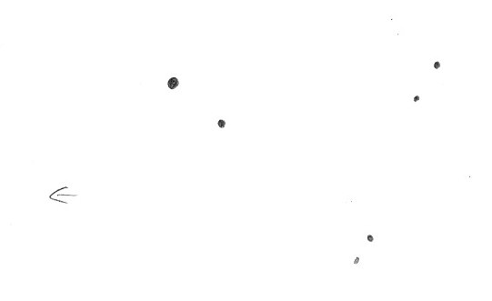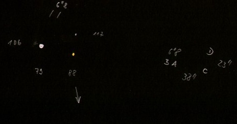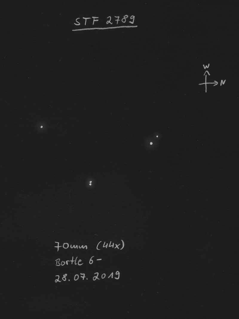 HJ5532 (AB-C): bei 45x zeigt sich C bereits weit getrennt von AB und wirkt grau - Helligkeitsunterschied 1.5 Magnituden (tatsächlich sind es 2.33 mag), die Trennung von AB (Sep. 0,7") habe ich auch probiert, dann aber bei 240x aufgegeben, das Seeing war grottig |