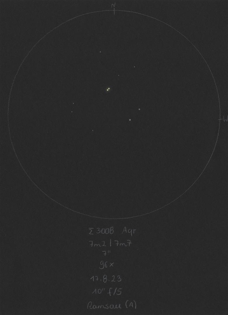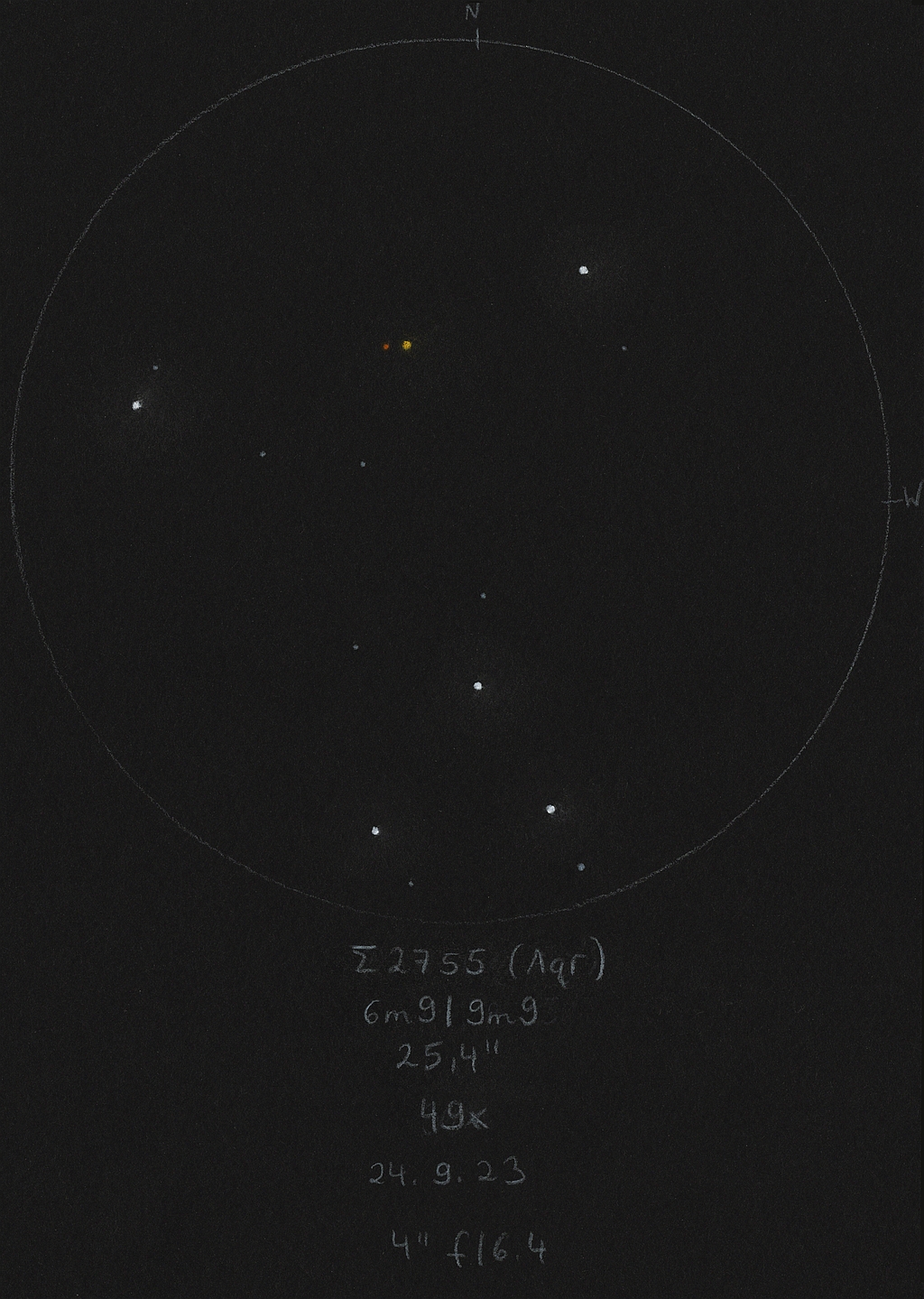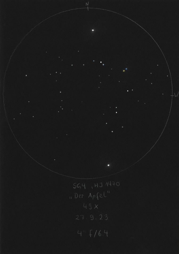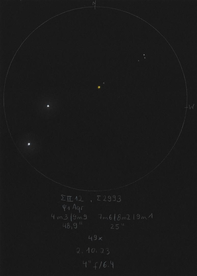 A-BC: 02.10.23: bei 21-fach als nordwestlichster der drei "Psi-Aquarii-Sterne" und gleich warmgold zu sehen - bei 49-fach taucht nordwestlich von der vor allem im Gegensatz zu Psi 2 und Psi 3 schön goldgelben A-Komponente mit weißem Farbtupfer mittig weit abgesetzt der ganz schwache, dunkelgraue Begleiter auf |