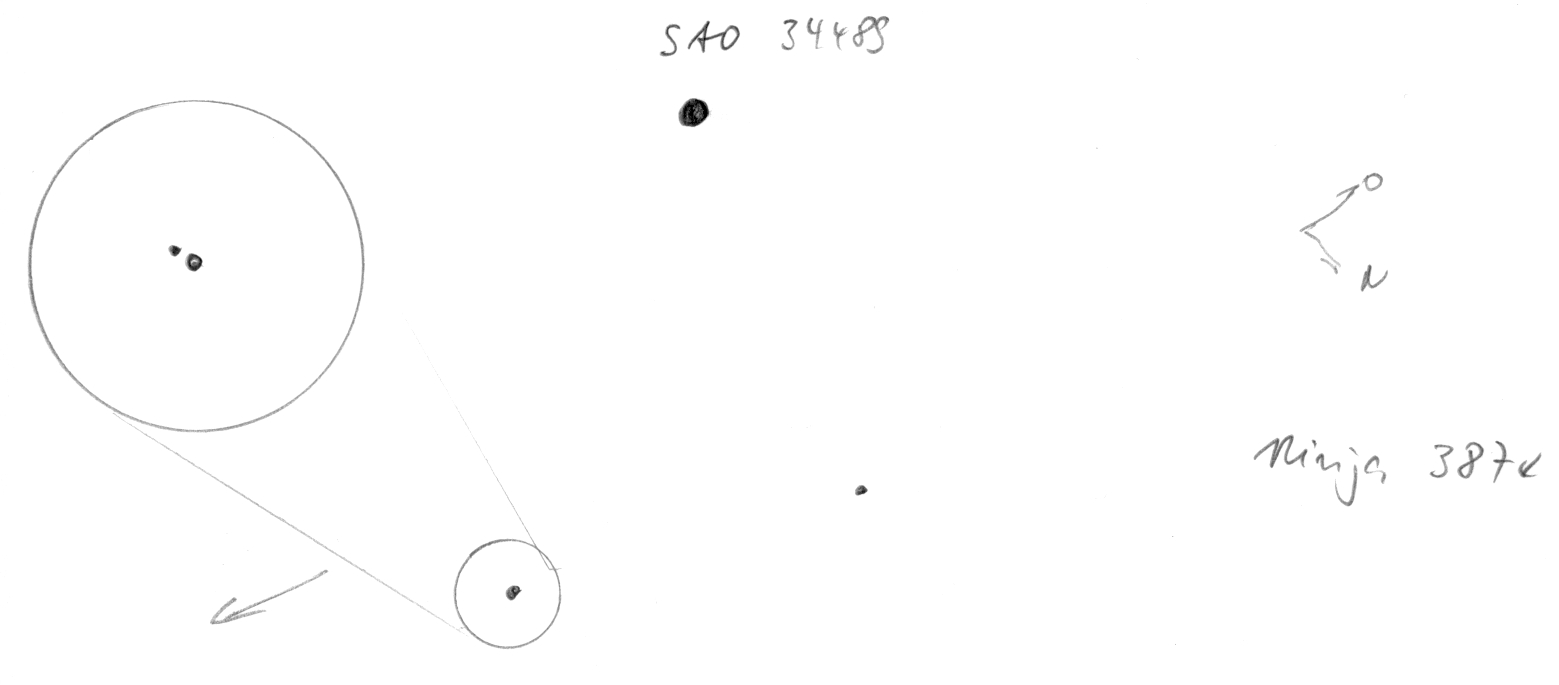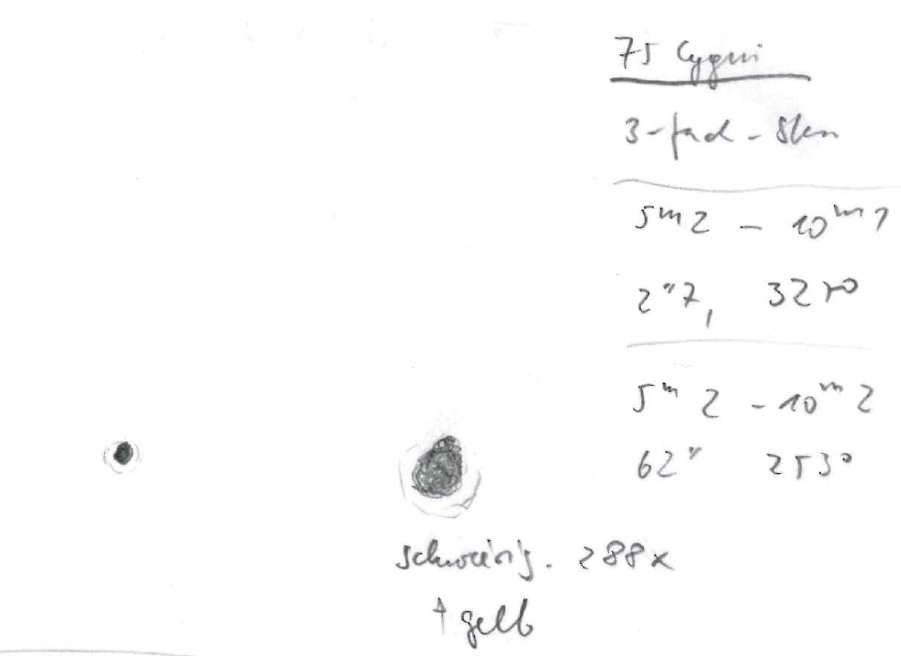 STF3012: Es war schwierig zu erkennen, welcher Stern der hellere war. Die Trennung war insgesamt nicht einfach. Anfangs sah ich nur einen länglichen Stern. STF3013: Anfangs sah ich nur einen länglichen Stern. Der große Helligkeitsunterschied macht die Trennung interessanterweise einfacher als STF3012. |