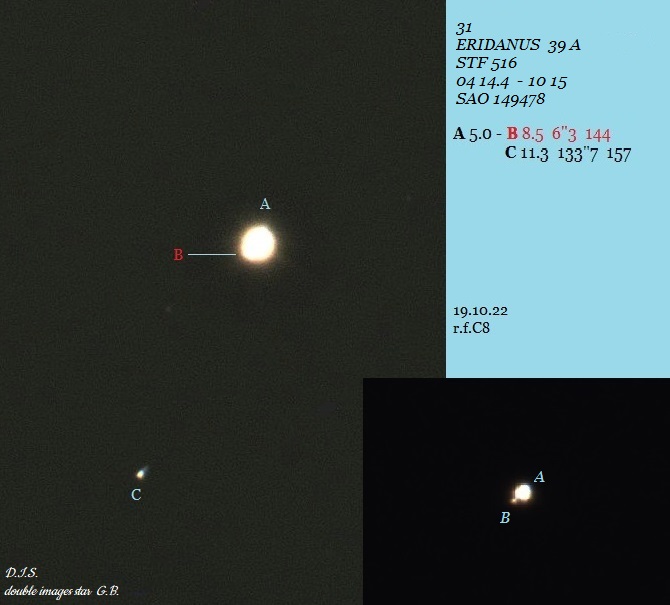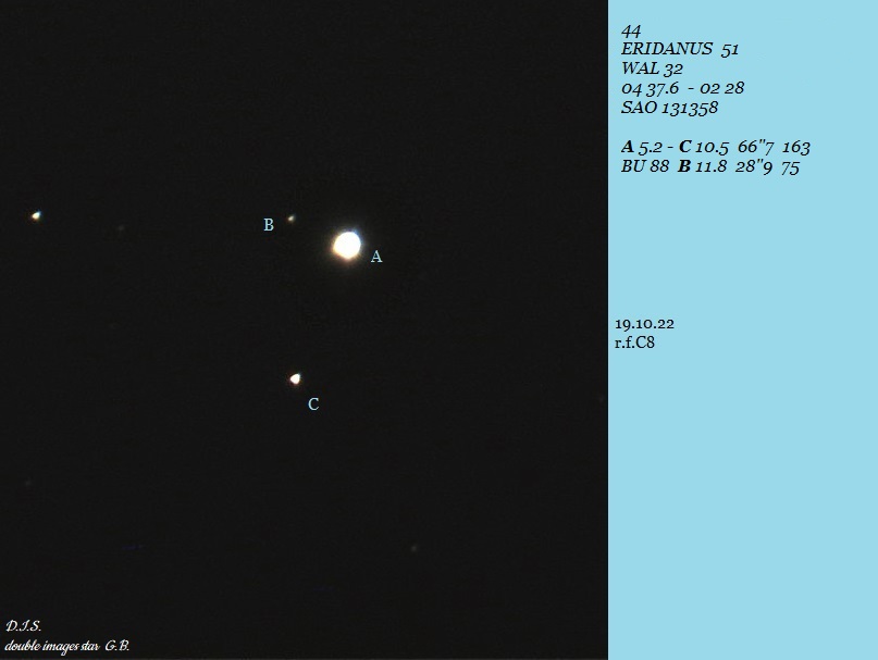 AC: Handgehalten: AC weit auseinander und sofort als Doppel auffällig. Auf Stativ: Weit auseinander aber trotzdem sehr doppelsternig erscheinend. C hellblau. Arnold 37 ist ein physikalischer Doppelstern in 364 Lichtjahren Abstand zu uns. |