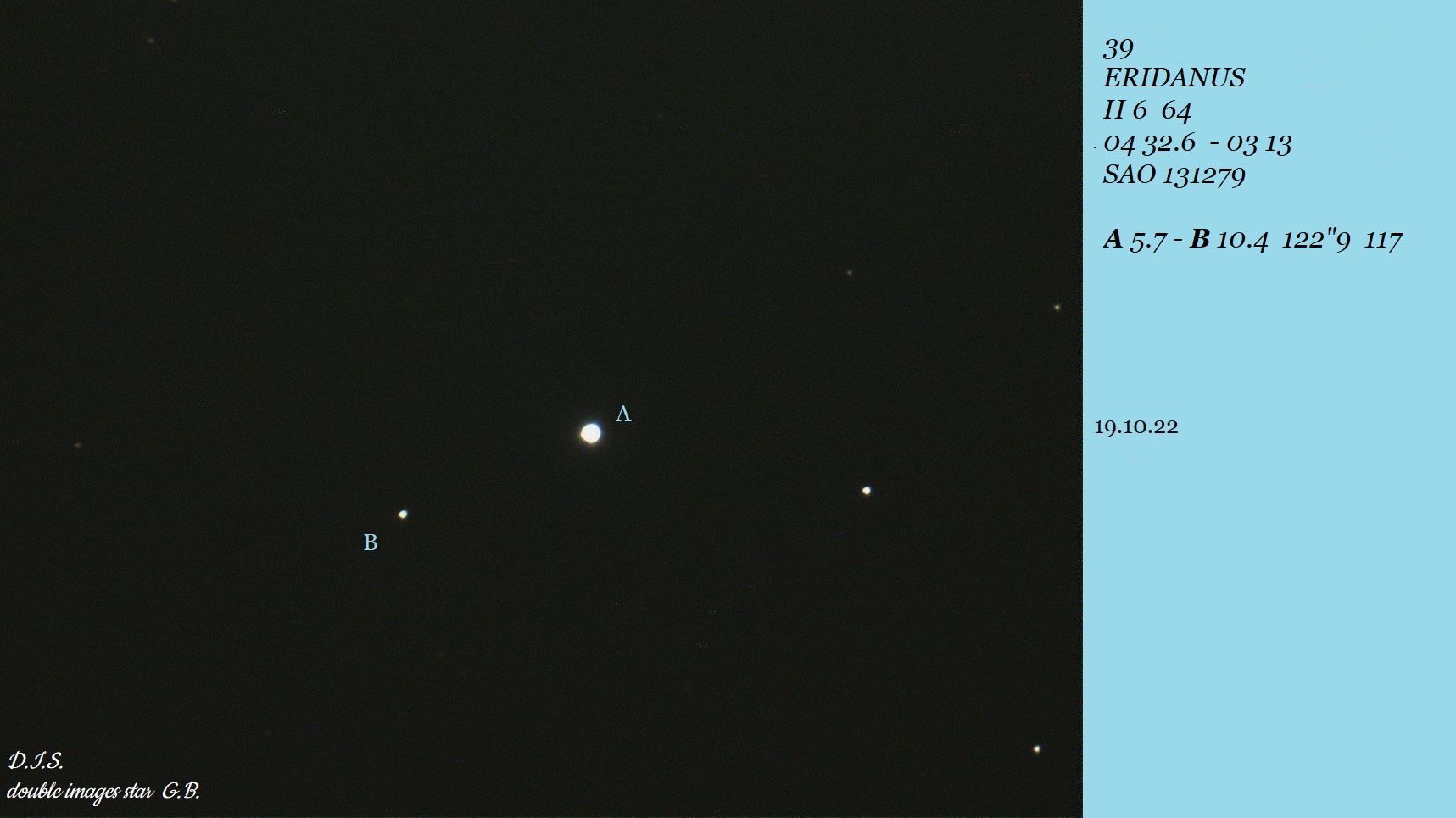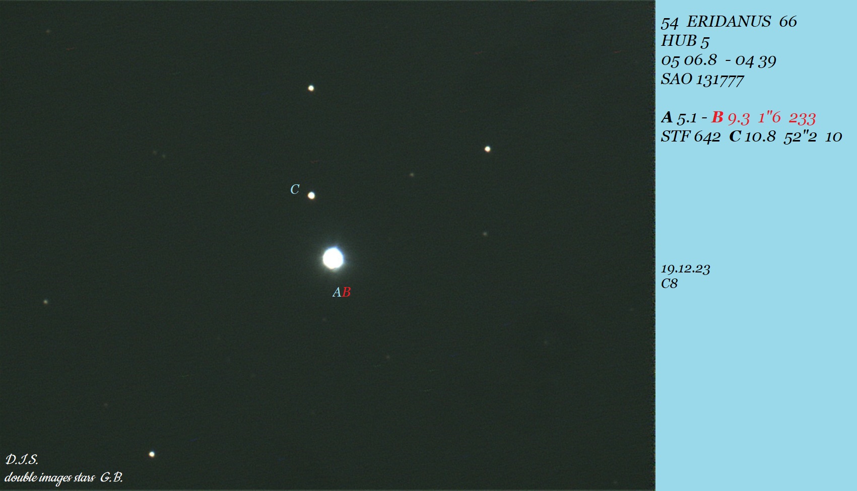 Wow! very fine, near equal faint pair, nicely split. I'm really surprised it wasn't discovered before since any one of the greats could have seen it -- I wonder if it is a physical binary and was at periastron 75-150 years ago, and only now coming to view? |