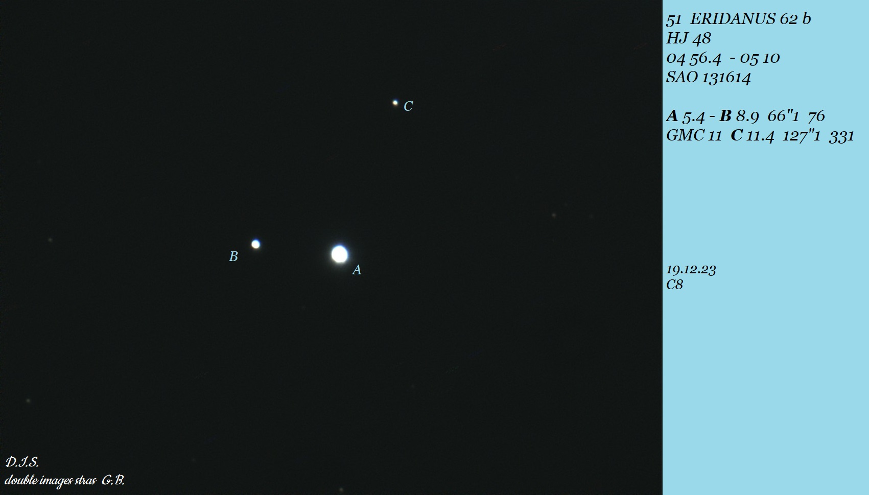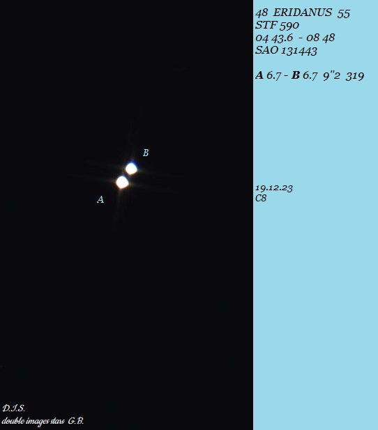 AB: trotz des offensichtlich großen Abstandes ist der Doppelstern bei diesen Bedingungen eine harte Nuss und Komponente B zeigt sich erst mit 57x südöstlich von A, vorher war der Stern wohl zu schwach auf der Brust - Abstand mehr als ordentlich |