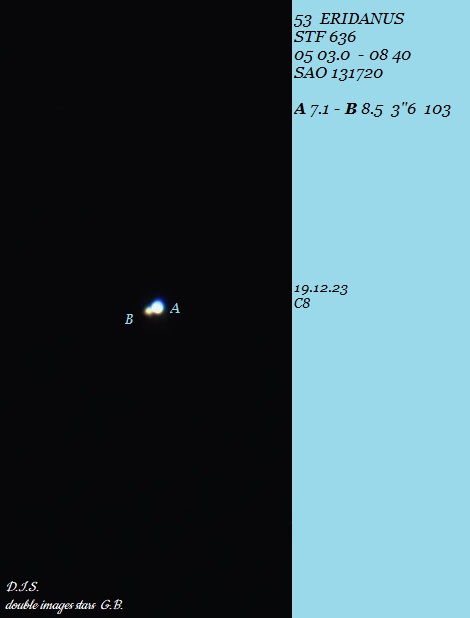 AB: 20x reicht zwar schon für eine klare Trennung, aber Komponente B im Osten ist nur dumpf grau-blau und noch zu schwach für den schönen Farbkontrast, der sich bei 32x offenbart - Komponente A strahlt dann in einem satten Bernsteingelb, B im Osten gibt sich unterkühlt bläulich - Helligkeitsunterschied 1 bis 1.5 Größenklassen, schwierig abschätzbar wegen der Farben |