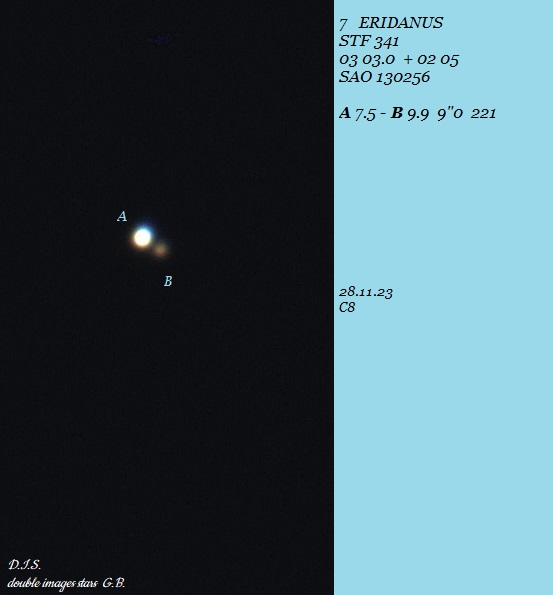 AB: bei 29x schön zusammen zu sehen mit S 502 - beide Sternpaare sind Südost-Nordwest-ausgerichtet, das Sternpaar hier ist heller und B steht entgegengesetzt zu S 502 im Nordwesten - das Sternpaar steht auch weiter auseinander - Komponente A ist hier reinweiß, B ist eine Größenklasse schwächer (sogar 1.74 mag lt. Stelle Doppie) und wirkt grau |