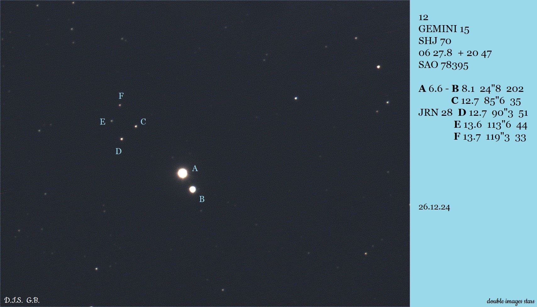 AB: einfach - beide Sterne zeigen sich komfortabel getrennt - Komponente A strahlt gelblich - Komponente B südöstlich wirkt dagegen grau und ist 1.5 bis 2 Größenklassen schwächer |
