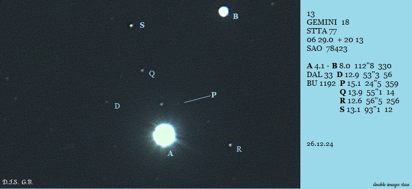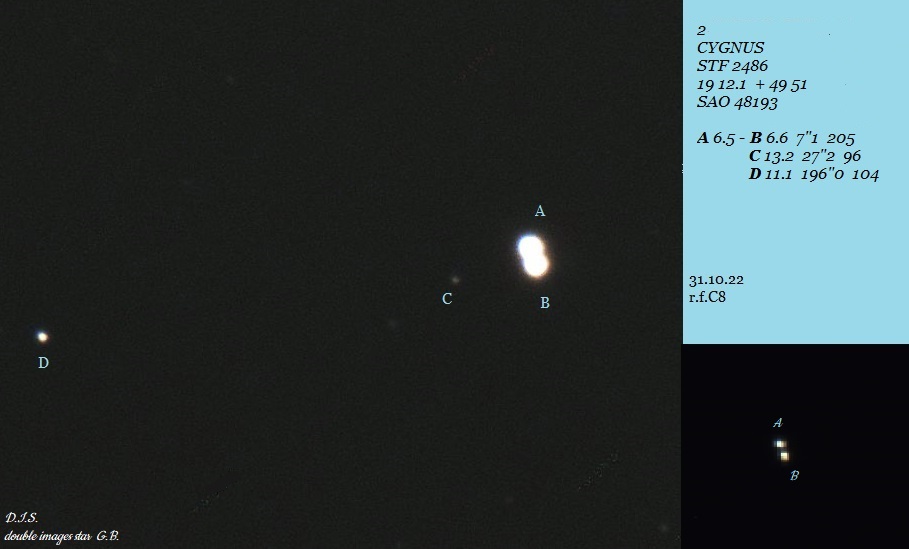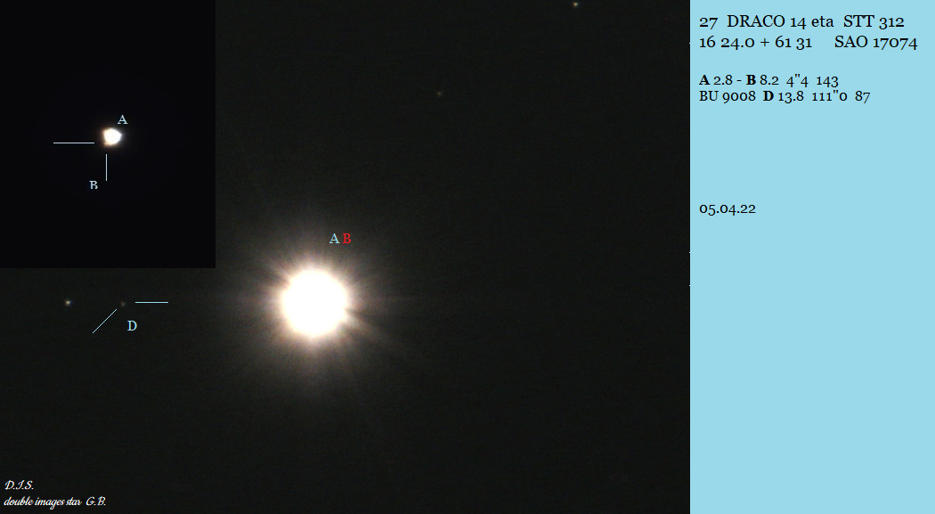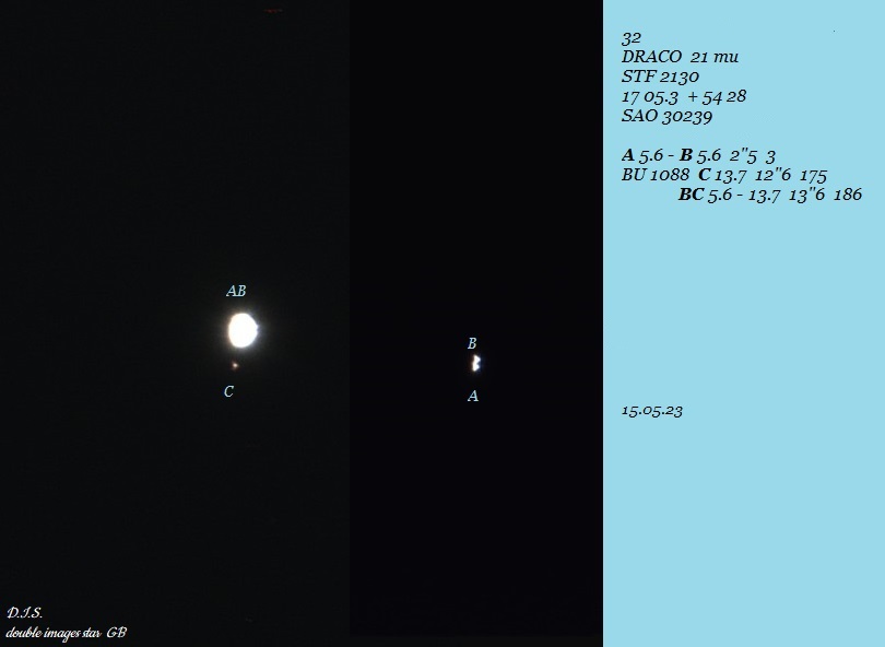 AB: bei 32x zeigt sich B ganz knapp getrennt nordwestlich von A - Helligkeitsunterschied gut 2 Größenklassen - der Doppelstern bildet mit drei helleren Sternen eine flache Drachenraute |