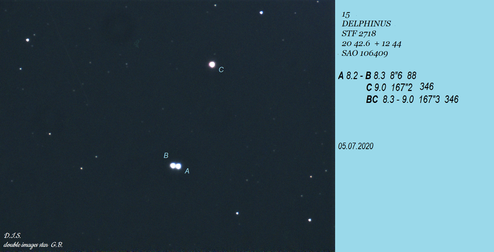 A-BC: Laut Stelledoppie bilden A und BC ein physikalisches Paar, und B und C sind wieder ein enges physikalisches Paar, also ein echtes Dreifachsystem in 150 Lichtjahren Entfernung. Für die Trennung von A-BC reicht eigentlich eine kleinere Öffnung, aber mit 8 Zoll kommt der Farbkontrast von A zu BC heraus und das Paar dominiert das Sehfeld von 0,3°. Sehenswert, denn A ist zitronengelb, BC ziegelrot. |