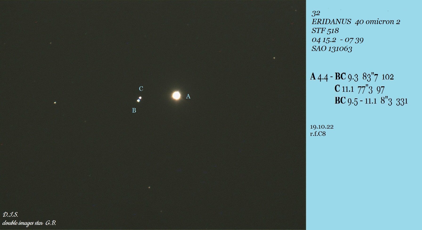 05.11.2021: Bei 21x ist das Paar A-BC weit getrennt, die Komponenten wirken ähnlich hell. A zeigt sich weiß-bläulich, BC eher leicht orange. Teils wechselt die Farbe zwischen den Komponenten. Bei 46x erscheint dann BC deutlich länglich mit leichter Einkerbung, bei 86x klar getrennt bei nahezu gleich hellen Komponenten. Der Farbeindruck bleibt bestehen: A weiß-bläulich, B & C leicht orange. Alle drei Komponenten liegen auf einer Linie. Lohnend. |