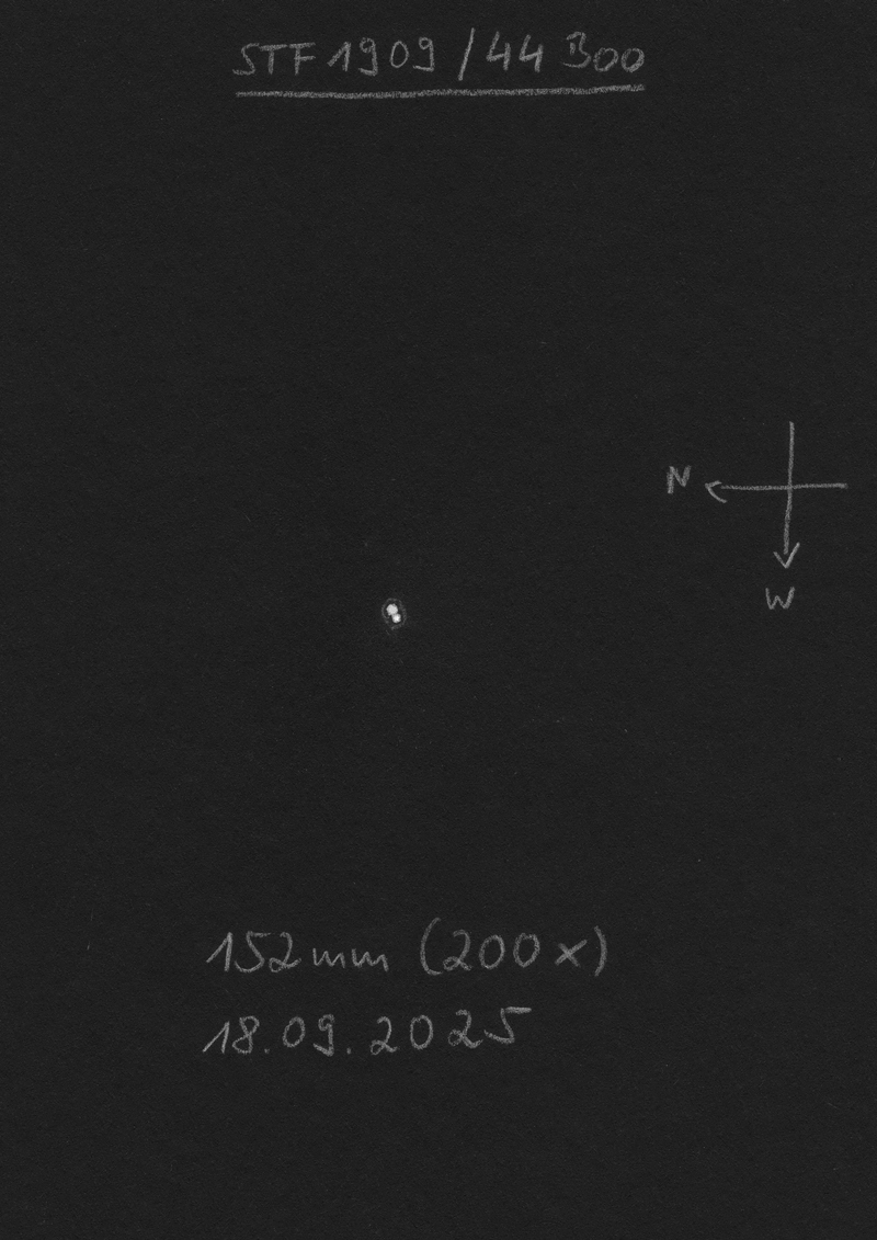 STF3012: Es war schwierig zu erkennen, welcher Stern der hellere war. Die Trennung war insgesamt nicht einfach. Anfangs sah ich nur einen länglichen Stern. STF3013: Anfangs sah ich nur einen länglichen Stern. Der große Helligkeitsunterschied macht die Trennung interessanterweise einfacher als STF3012. |